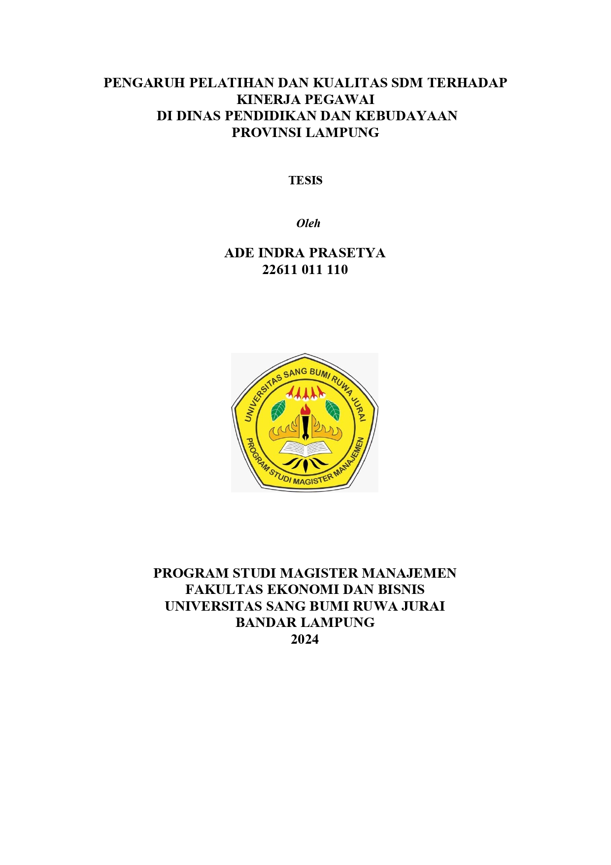 Menyadari pentingnya unsur SDM dalam suatu organisasi, maka pantaslah jika dikatakan bahwa manusia adalah aset yang paling berharga dan memiliki dampak langsung pada organisasi tersebut dibandingkan dengan sumber daya yang lain. Arah pembangunan nasional saat ini tertuju pada pentingnya peningkatan kinerja pegawai. Hal ini dapat ditempuh dengan memberikan pendidikan dan pelatihan bagi pegawai dengan harapan dapat membekali mereka dengan kemampuan dan keahlian yang sesuai dengan peran dan fungsinya. Namun demikian, kenyataannya menunjukkan bahwa upaya dimaksud belum dapat dapat sepenuhnya mengubah citra pegawai yang berorientasi pada paradigma kerja yang produktif. Tujuan dari Penelitian ini adalah untuk Mengetahui : 1. Pengaruh pelatihan terhadap kinerja pegawai 2. Pengaruh kualitas SDM terhadap kinerja pegawai 3. Pengaruh pelatihan dan kualitas SDM secara bersama-sama terhadap kinerja pegawai Dinas Pendidikan dan Kebudayaan Provinsi Lampung. Penelitian ini menggunakan metode penelitian deskriptif kuantitatif yaitu metode penelitian yang menggunakan data berupa angka dalam menganalisis fakta-fakta yang ditemukan yang bertujuan untuk menentukan hubungan antar variabel dalam sebuah populasi. Analisis yang digunakan adalah regresi sederhana dan berganda. Penelitian ini menggunakan 72 responden.
