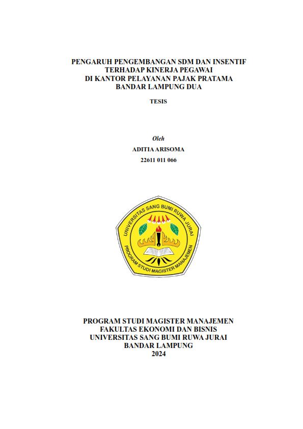 Sumber Daya Manusia sebagai salah satu aset , merupakan sesuatu yang sangat strategis bagi instansi pemerintah dalam rangka mewujudkan pemerintahan yang akuntabel, bersih, serta mampumemberikan pelayanan publik yang prima. Peran SDM dalam kemajuan suatu organisasi khususnyaorganisasi sektor publik atau instansi pemerintahan tidak dapat diabaikan begitu saja. Apabila SDMdalam suatu instansi pemerintahan memiliki SDM yang baik, disiplin, loyal, dan produktif makaorganisasi atau instansi akan berkembang pesat,namun kebalikannya jika memiliki SDM yang tidakdisiplin, korupsi, kolusi, dan nepotisme,instansi pemerintahan tersebut akan hancur dan tidakbertahan lama. Selain pengembangan SDM, salah satu faktor yang juga mempengaruhi kinerjapegawai yaitu adalah faktor insentif. Beberapa ahli manajemen percaya bahwa secara logis pegawaimemerlukan insentif sebagai pendorong untuk menampilkan kinerja terbaiknya. Penelitian ini menggunakan metode penelitian deskriptif kuantitatif yaitu metode penelitianyang menggunakan data berupa angka dalam menganalisis fakta-fakta yang ditemukan yang bertujuanuntuk menentukan hubungan antar variabel dalam sebuah populasi. Analisis yang digunakan adalahregresi sederhana dan berganda. Penelitian ini menggunakan 29 responden. Berdasarkan hasil analisis data ditemukan jawaban hipotesis yakni sebagai berikut; Terdapatpengaruh Pengembangan SDM (X1) terhadap Kinerja (Y) pegawai di KPP Pratama Bandar LampungDua, dengan tingkat pengaruh (R-square) sebesar 74,1%. Terdapat pengaruh Insentif terhadap Kinerjapegawai di KPP Pratama Bandar Lampung Dua dengan tingkat pengaruh sebesar 72,6%. Terdapatpengaruh Pengembangan SDM dan Insentif secara bersama-sama terhadap Kinerja pegawai di KPPPratama Bandar Lampung Dua, dengan tingkat pengaruh sebesar 77,8%