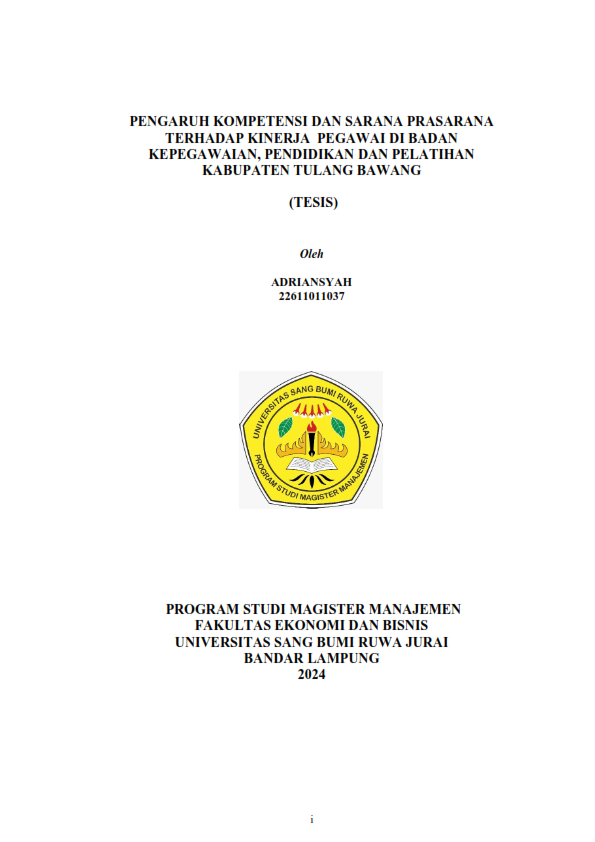 Hasil pengamatan penulis pada Badan Kepegawaian Pendidikan dan Pelatihan KabupatenTulang Bawang, ditemukan fakta bahwa kinerja pegawai masih belum optimal. Hal ini diindikasikan dengan adanya Sasaran Kegiatan yang tidak tercapai sesuai target.Permasalahan lemahnya kinerja pegawai ini diyakini sebagai dampak dari faktor kompetensisumber daya manusia dan sarana prasarana yang belum ideal. Kompetensi sumber dayamanusia perlu mendapat perhatian serius, terlihat dari masih ada pegawai memiliki latarbelakang pendidikan yang tidak sesuai dengan beban kerjanya. Sarana prasarana yang kurangkondusif, seperti keterbatasan peralatan komputer dan perangkat pendukungnya yang masihminim, hal ini dirasakan sebagai salah satu faktor yang menghambat kinerja pegawai. Tujuan penelitian ini adalah untuk mengetahui pengaruh kompetensi sumber daya manusia dan sarana prasarana terhadap kinerja pegawai. Hipotesis pada penelitian ini adalah adapengaruh kompetensi sumber daya manusia dan sarana prasarana baik secara parsial maupunsecara simultan terhadap kinerja pegawai. Sampel pada penelitian ini berjumlah 66 orang pegawai. Teknik pengumpulan datameliputi kegiatan observasi, dokumentasi dan angket. Metode analisis data menggunakanpendekatan kuantitatif dengan bantuan alat statistik SPSS versi 21.0 meliputi perhitungan ujivaliditas, uji reliabilitas, uji regresi linier sederhana dan berganda, uji t, uji F dan uji koefisiendeterminasi. Hasil pengujian hipotesis menunjukkan bahwa kompetensi sumber daya manusia secaraparsial berpengaruh positif terhadap kinerja dengan kontribusi sebesar 65,60%. Saranaprasarana berpengaruh positif terhadap kinerja dengan kontribusi sebesar 50,80%. Pengujianhipotesis secara simultan menunjukkan bahwa kompetensi sumber daya manusia dan saranaprasarana secara bersama-sama berpengaruh positif terhadap kinerja dengan kontribusisebesar 72,1%, sedangkan sisanya sebesar 27,9% merupakan variasi variabel lain di luarpenelitian ini. Kata Kunci: kompetensi sumber daya manusia, sarana prasarana, kinerja pegawai