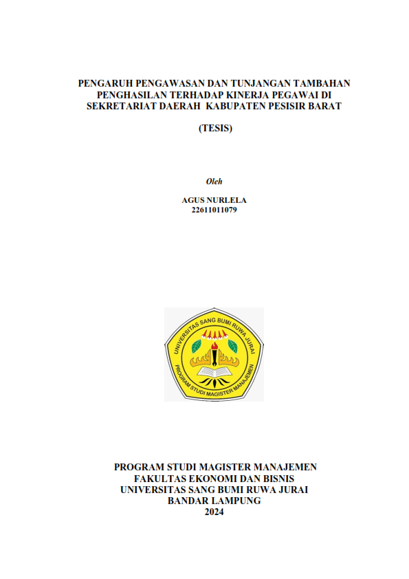 Hasil pengamatan penulis pada Sekretariat Daerah Kabupaten Pesisir Barat, ditemukan fakta bahwa kinerja pegawai masih belum berada di titik maksimal. Hal ini diindikasikan dengan adanya sasaran kegiatan yang tidak tercapai sebagaimana yang telah direncanakan. Permasalahan lemahnya kinerja pegawai ini diyakini sebagai dampak dari faktor pengawasan dan tunjangan tambahan penghasilan yang belum berjalan sebagaimana mestinya. Pengawasan belum dijalankan secara maksimal, terlihat dari fungsi pengawasan belum dilaksanakan secara menyeluruh. Besaran tunjangan tambahan penghasilan belum mampu mendorong pegawai bekerja secara optimal, hal ini dikarenakan masih dirasakan terjadi kesenjangan dalam penetapan besarannya. Tujuan penelitian ini adalah untuk mengetahui pengaruh pengawasan dan tunjangan tambahan penghasilan terhadap kinerja pegawai. Hipotesis pada penelitian ini adalah ada pengaruh pengawasan dan tunjangan tambahan penghasilan baik secara parsial maupun secara simultan terhadap kinerja pegawai. Sampel pada penelitian ini berjumlah 62 orang pegawai. Teknik pengumpulan data meliputi kegiatan observasi, dokumentasi dan angket. Metode analisis data menggunakan pendekatan kuantitatif dengan bantuan alat statistik SPSS versi 21.0 meliputi perhitungan uji validitas, uji reliabilitas, uji regresi linier sederhana dan berganda, uji t, uji F dan uji koefisien determinasi.