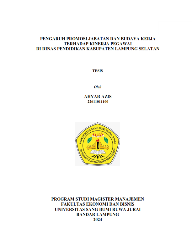Sumber Daya Manusia (SDM) mempunyai peran penting dalam mengembangkan tatanan pemerintahan. Keberhasilan instansi pemerintah dalam menjalankan kegiatannya tidak lepas dari kinerja sumber daya manusia yang berada didalamnya Promosi jabatan merupakan salah satu bagian dari program penempatan yang dilakukan oleh organisasi atau instansi. Penempatan pegawai dapat dilakukan dengan membuat penyesuaian terhadap kebutuhan organisasi yang berhubungan dengan perencanaan sehingga diperoleh orang yang tepat pada posisi yang tepat pula. Fenomena yang terjadi tentang promosi jabatan di lingkungan Dinas Pendidikan Kabupaten Lampung Selatan adalah kurangnya sosialisasi dan transparansi pihak berkaitan dengan kriteria promosi yang akan dilakukan terhadap pegawai tertentu seringkali menimbulkan pertanyaan dikalangan pegawai. Beberapa permasalahan yang dihadapi Dinas Pendidikan secara perlahan dapat menurunkan kinerja pegawai. Belum adanya pengambilan tindakan berkaitan dengan pemecahan masalah ini dikhawatirkan dapat mempengaruhi kinerja pegawai lain yang memiliki keinginan untuk bekerja dengan baik dan sungguh-sungguh. Tujuan dari Penelitian ini adalah untuk Mengetahui : 1. Pengaruh Promosi Jabatan terhadap kinerja pegawai 2. Pengaruh Budaya Kerja terhadap kinerja pegawai 3. Pengaruh promosi jabatan dan budaya kerja secara bersama-sama terhadap kinerja pegawai Dinas Pendidikan Kabupaten Lampung Selatan. Penelitian ini menggunakan metode penelitian deskriptif kuantitatif yaitu metode penelitian yang menggunakan data berupa angka dalam menganalisis fakta-fakta yang ditemukan yang bertujuan untuk menentukan hubungan antar variabel dalam sebuah populasi. Analisis yang digunakan adalah regresi sederhana dan berganda. Penelitian ini menggunakan 40 responden. Berdasarkan hasil analisis data ditemukan jawaban hipotesis yakni sebagaiberikut; Terdapat pengaruh Promosi Jabatan (X1) terhadap Kinerja (Y) di Dinas Pendidikan Kabupaten Lampung Selatan, dengan tingkat pengaruh (R-square) sebesar 72,8%, Terdapat pengaruh Budaya Kerja terhadap Kinerja pegawai di Dinas Pendidikan Kabupaten Lampung Selatan dengan tingkat pengaruh sebesar 81,2%. Terdapat pengaruh Promosi Jabatan dan Budaya Kerja secara bersamasama terhadap Kinerja pegawai di Dinas Pendidikan Kabupaten Lampung Selatan., dengan tingkat pengaruh sebesar 82,5%.