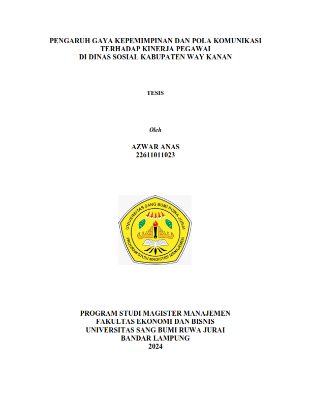 Kepemimpinan merupakan suatu cara pemimpin untuk mempengaruhi bawahannya yang dinyatakan dalam bentuk pola tingkah laku atau kepribadiansehingga kinerja organisasi dan tujuan organisasi dapat dimaksimalkan. Perankepemimpinan sangat strategis dan penting dalam sebuah organisasi sebagai salahsatu penentu keberhasilan dalam pencapaian misi, visi dan tujuan suatu organisasi.Fenomena gaya kepemimpinan di Dinas Sosial Kabupaten Way Kanan masihbanyak kekurangan, adapun permasalahan yang terjadi di instansi tersebut adalahbelum optimalnya pemimpin menyampaikan informasi atau berita kepadabawahan, sehingga terkadang pegawai atau bawahan tidak mengerti sehinggatidak mampu melaksanakan tugas yang diinginkan oleh pimpinan, kebijakanpimpinan berkaitan dengan tugas dan fungsi bawahannya tidak sesuai sehinggaberakibat kurang maksimal kinerja yang dihasilkan, serta kurang tegasnyapemimpin terhadap ketidakdisiplinan pegawai terkadang datang terlambat maupuntidak hadir, sehingga mengakibatkan kinerja pegawai mengalami penurunan, danhal ini mempengaruhi komitmen kerja pegawai, yang berakibat pada menurunnyakinerja yang dicapai oleh setiap pegawai. Tujuan dari Penelitian ini adalah untuk Mengetahui : 1. Pengaruh Gayakepemimpinan terhadap kinerja pegawai 2. Pengaruh Pola komunikasi terhadapkinerja pegawai 3. Pengaruh gaya kepemimpinan dan pola komunikasi secarabersama-sama terhadap kinerja pegawai di Dinas Sosial Kabupaten Way Kanan.Penelitian ini menggunakan metode penelitian deskriptif kuantitatif yaitu metodepenelitian yang menggunakan data berupa angka dalam menganalisis fakta-faktayang ditemukan yang bertujuan untuk menentukan hubungan antar variabel dalamsebuah populasi. Analisis yang digunakan adalah regresi sederhana dan berganda.Penelitian ini menggunakan 91 responden. Berdasarkan hasil analisis data ditemukan jawaban hipotesis yakni sebagaiberikut; Terdapat pengaruh Gaya Kepemimpinan (X1) terhadap Kinerja (Y) diDinas Sosial Kabupaten Way Kanan, dengan tingkat pengaruh (R-square) sebesar71,8%. Terdapat pengaruh Pola Komunikasi terhadap Kinerja pegawai di DinasSosial Kabupaten Way Kanan dengan tingkat pengaruh sebesar 77,1%. Terdapatpengaruh Gaya Kepemimpinan dan Pola Komunikasi secara bersama-samaterhadap Kinerja pegawai di Dinas Sosial Kabupaten Way Kanan, dengan tingkatpengaruh sebesar 79,3%.