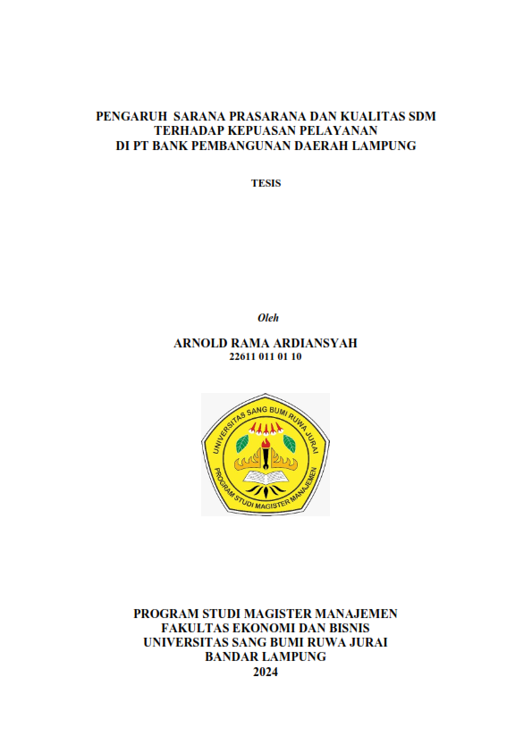 Di era perdagangan bebas saat ini, perusahaan khususnya perbankan menghadapi persaingan yang ketat sehingga memerlukan fokus pada kebutuhan konsumen. Untuk berkembang, bank harus melampaui ekspektasi nasabah dengan menawarkan layanan yang lebih unggul dibandingkan pesaingnya. Hanya mereka yang memiliki produk berkualitas tinggi yang dapat mendominasi pasar. Perkembangan global yang pesat, didorong oleh ilmu pengetahuan dan teknologi, memperketat persaingan ini, mendorong bank untuk terus meningkatkan penawaran mereka untuk mempertahankan posisi pasar. Untuk memenangkan kompetisi ini, bank harus mengutamakan kepuasan nasabah di atas segalanya.Pada penelitian ini digunakan menggunakan metode analisis kualitatifmenggunakan rumus slovin. Hasil penelitian menunjukkan Terdapat pengaruh Sarana Prasarana (X1) terhadap Kepuasan Layanan (Y) pekerja pada PT. Bank Pembangunan Daerah Lampung melalui uji t sebesar = 5.910 > t tabel 1.662. Besarnya hubungan antara Sarana Prasarana dan Kepuasan Layanan sebesar 0,828 (Sangat Kuat) sedangkan besarnya pengaruh/Koefisien Determinasi (KD) Sarana Prasarana terhadap Kepuasan Layanan sebesar 68,6%, sedangkan sisanya sebesar 31,4% dipengaruhi oleh faktor lain diluar penelitian. Terdapat pengaruh Kualitas SDM terhadap Kepuasan Layanan pekerja pada PT. Bank Pembangunan Daerah Lampung adalah 0,936 termasuk dalam kategori Sangat Kuat. Besarnya pengaruh Sarana Prasarana dan Kualitas SDM secara bersama-sama terhadap Kepuasan Layanan sebesar 87,6% dan sisanya sebesar 12,4% dipengaruhi oleh faktor lain diluar penelitian. Besarnya hubungan Sarana Prasarana dan Kualitas SDM terhadap Kepuasan Layanan adalah 0,939 (Sangat Kuat). Kata Kunci : Bank, Nasabah, Sarana dan Prasarana.
